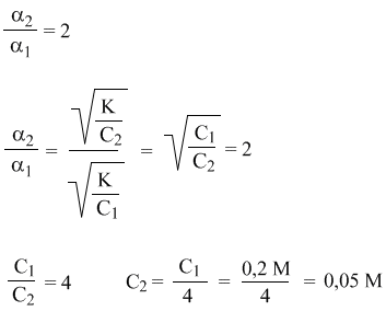 10.5. Прибавить 900 мл воды. Решение: пусть С1 = 0,2 моль/л – исходная концентрация, а С2 – неизвестная концентрация кислоты после разбавления. Воспользуемся законом разбавления Оствальда для слабых электролитов: К = α2С. По условию степень диссоциации после разбавление должна удвоиться (α2 = 2α1). Тогда:
