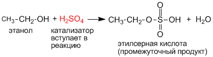 Реакцию проводят в растворе серной кислоты H2SO4 (она используется одновременно как катализатор и как растворитель). Механизм этой реакции следующий: сначала катализатор (H2SO4) реагирует с этанолом с образованием промежуточного соединения - этилсерной кислоты:
