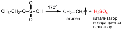Этилсерная кислота - не очень устойчивое соединение и при нагревании распадается на серную кислоту и этилен, который выделяется в виде газа. Таким образом, серная кислота вновь возвращается в реакцию и готова превратить в этилен новую порцию этанола: